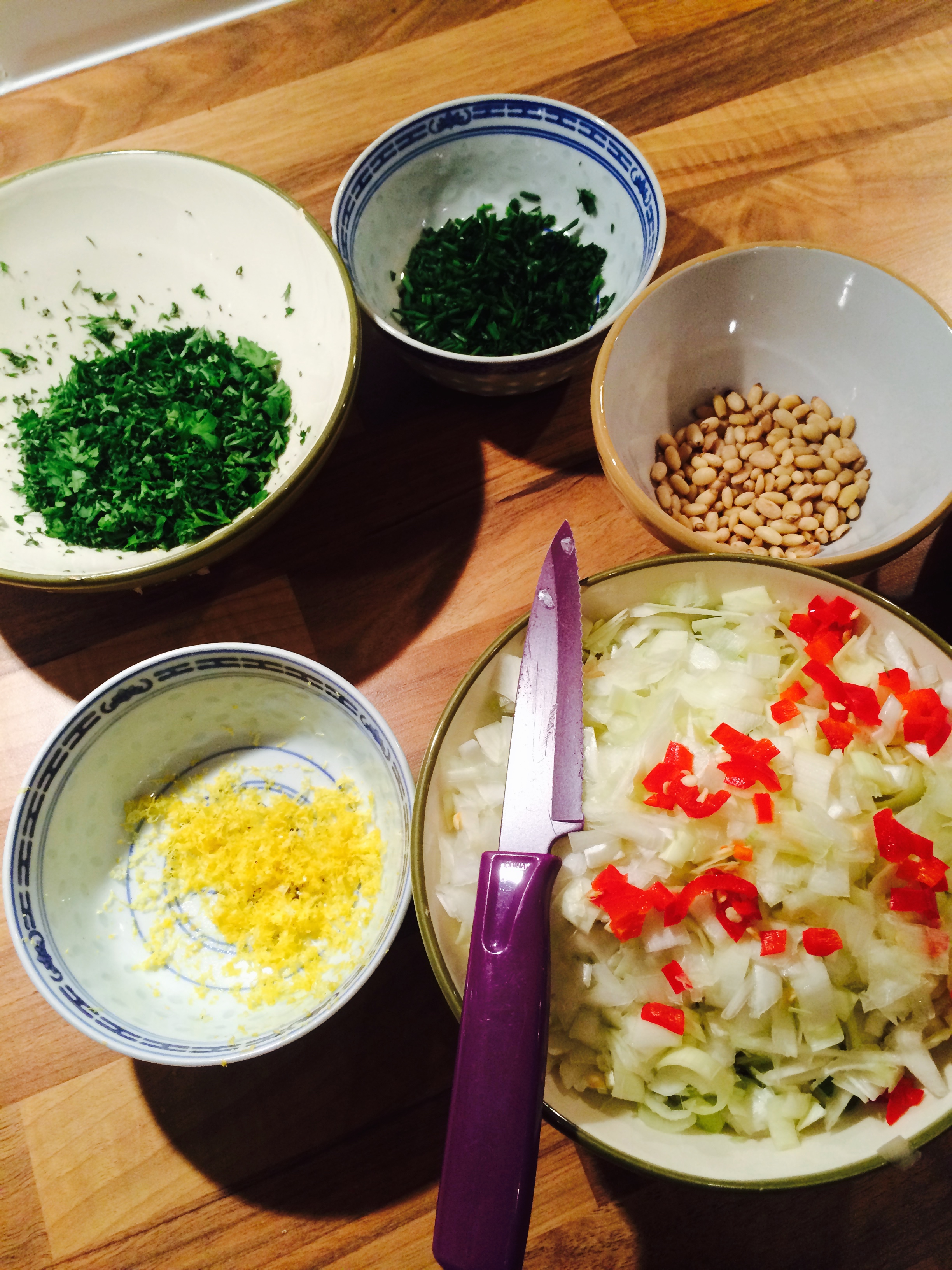 Finely chop the onions, leek and chilli. Do the same with the herbs. Leave to one side…