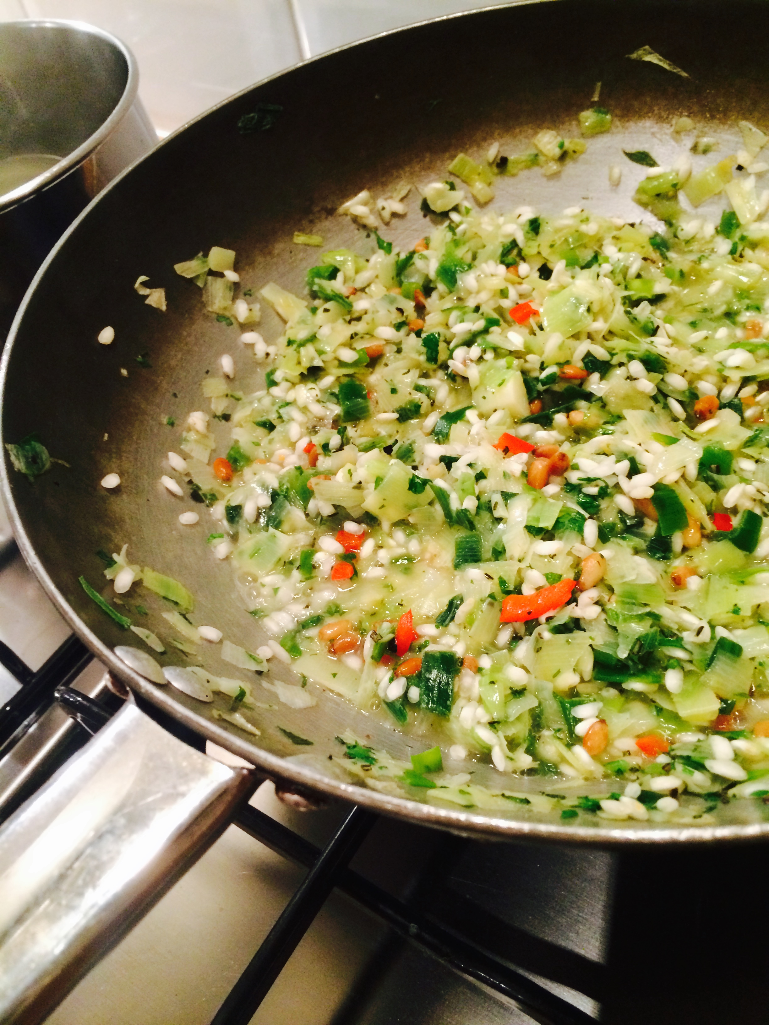 Stir well and keep on medium heat for 2 more minutes. At this point you can start adding the stock gradually using a ladle. Keep on medium-high, and as each batch of stock gets absorbed by the rice, add more until the rice softens. You’re looking at about 15-20 minutes.