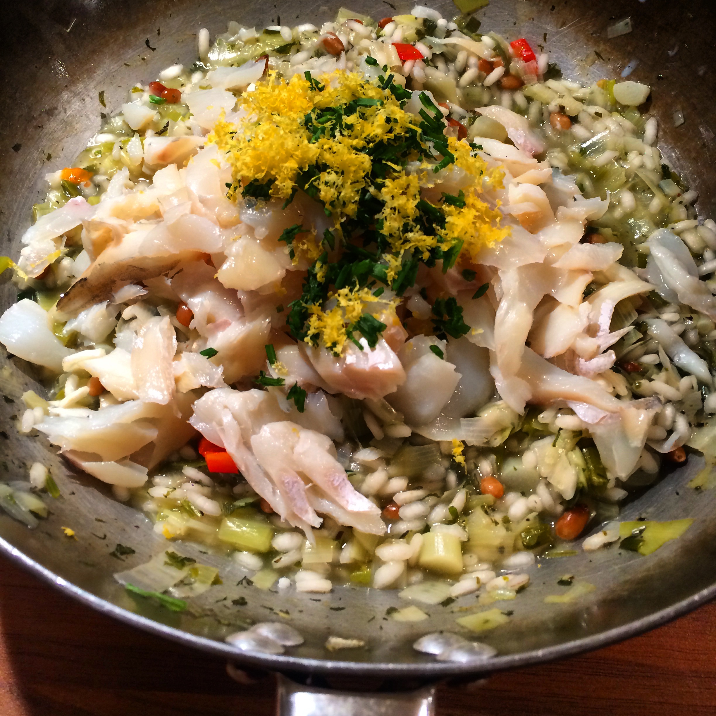 When you’re happy with the rice you can crumble the fish into it along with with the chives and lemon zest.
