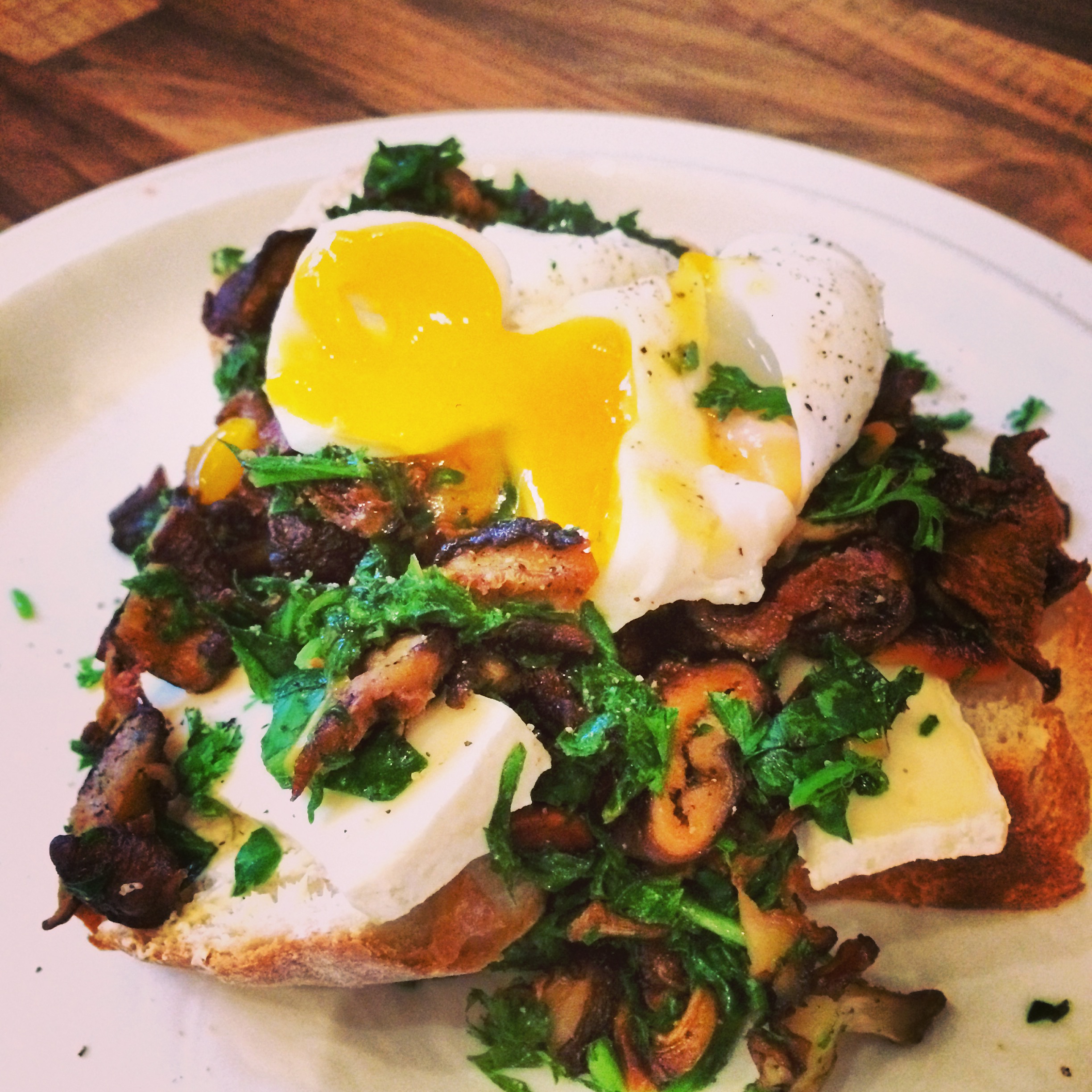 I had some leftover shiitake mushrooms, so I grilled them and added some chopped spinach and parsley. I served with a poached duck egg on some brie and crusty white bread. No meat in sight.