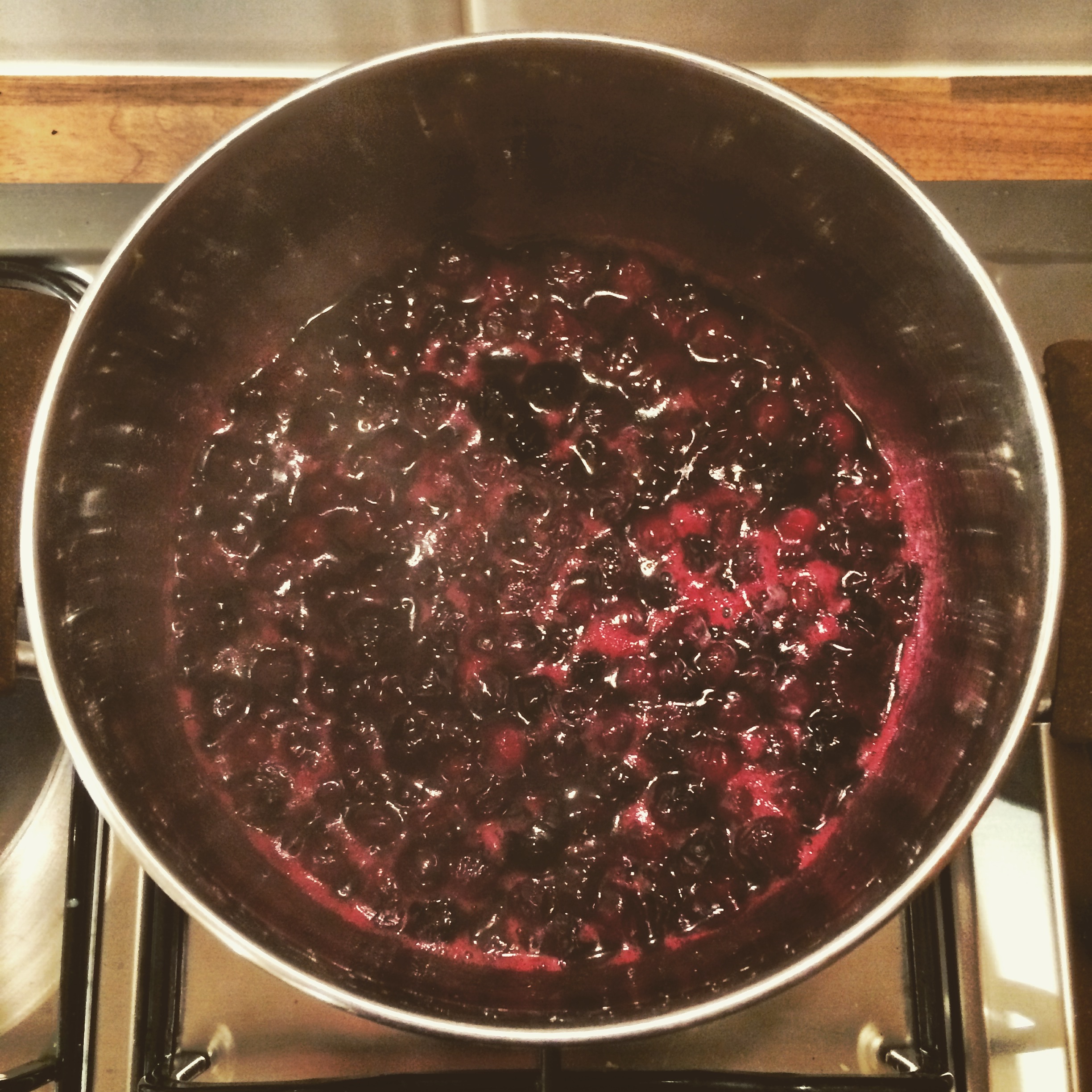 At the same time, heat your blueberries in a large sauce pan with the sugar and a splash of boiling water.