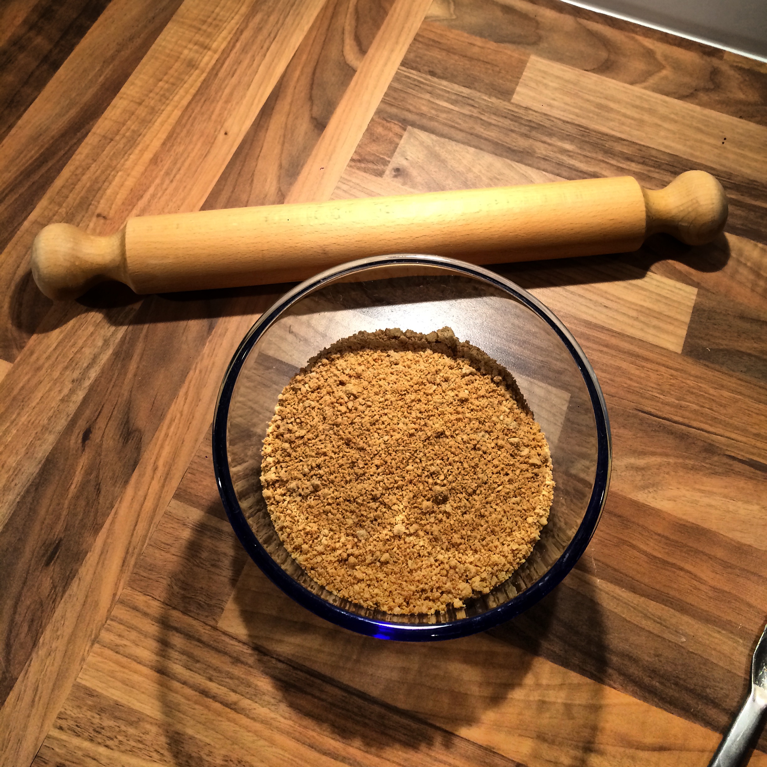 Start by setting your oven to 180 degrees celsius. Proceed to smash up your biscuits in whichever way you find most entertaining.