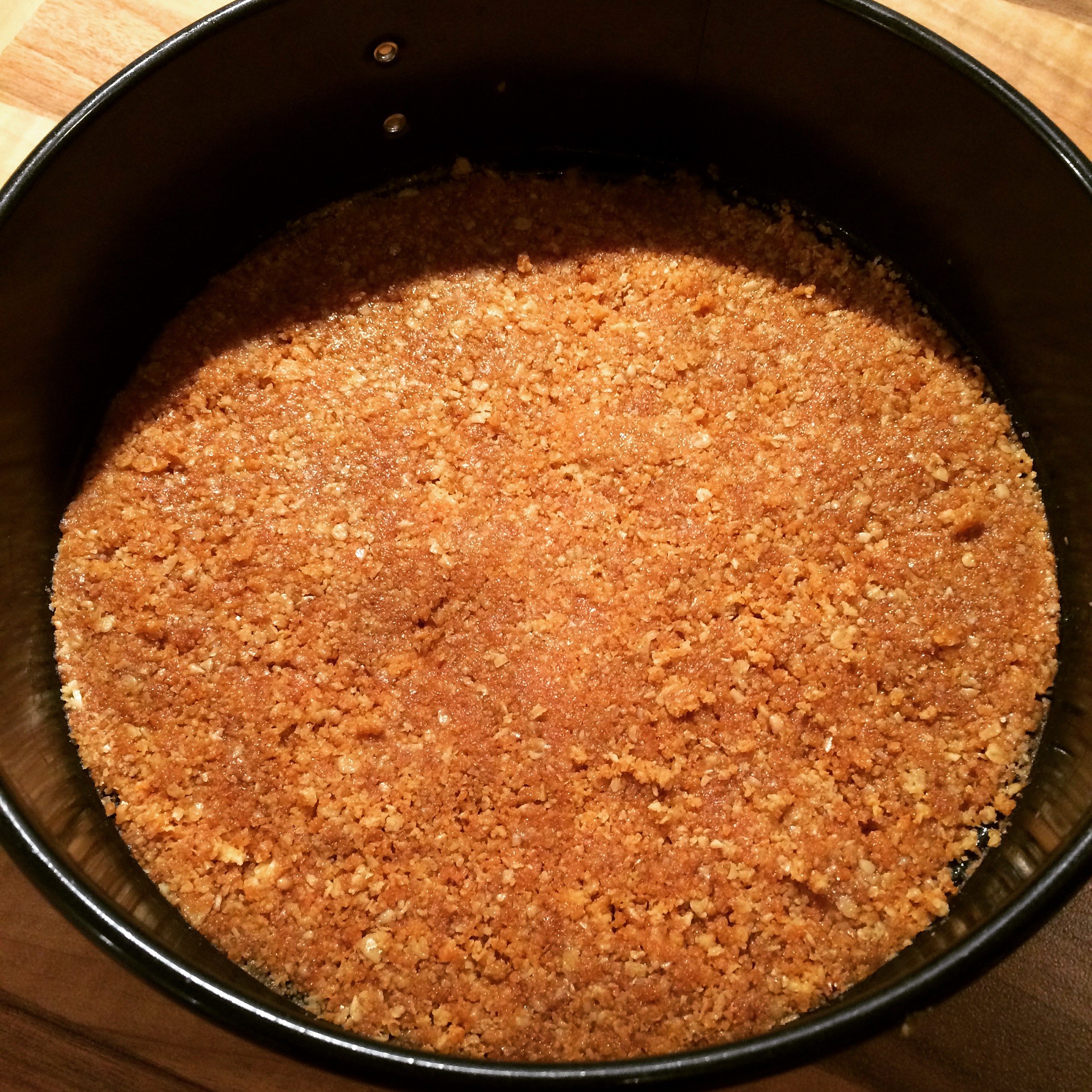 Combine with your smashed biscuits, and using the backside of a spoon, press the mix down firmly into the base of a baking tin.