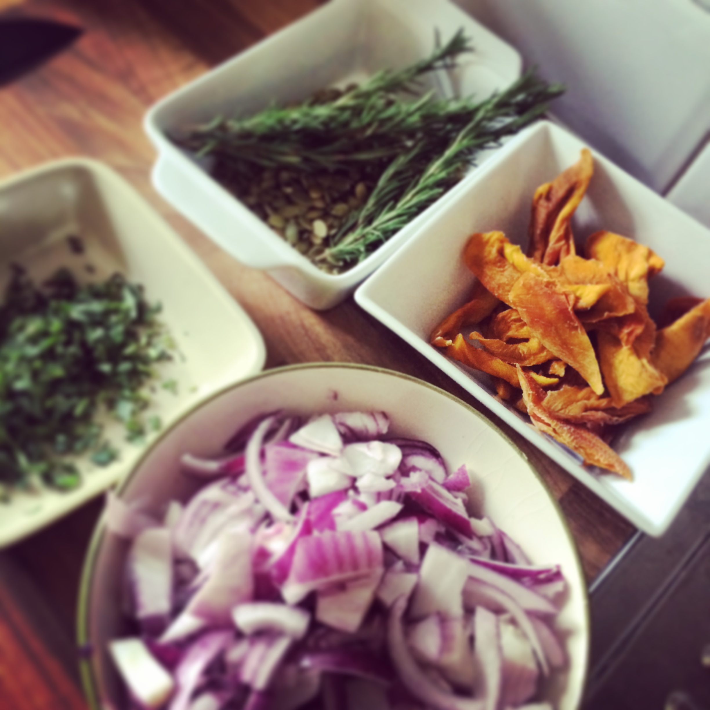 2 red onions, 1 tbsp smoked paprika and 1 tbsp cayenne pepper, fresh rosemary, mint and tarragon