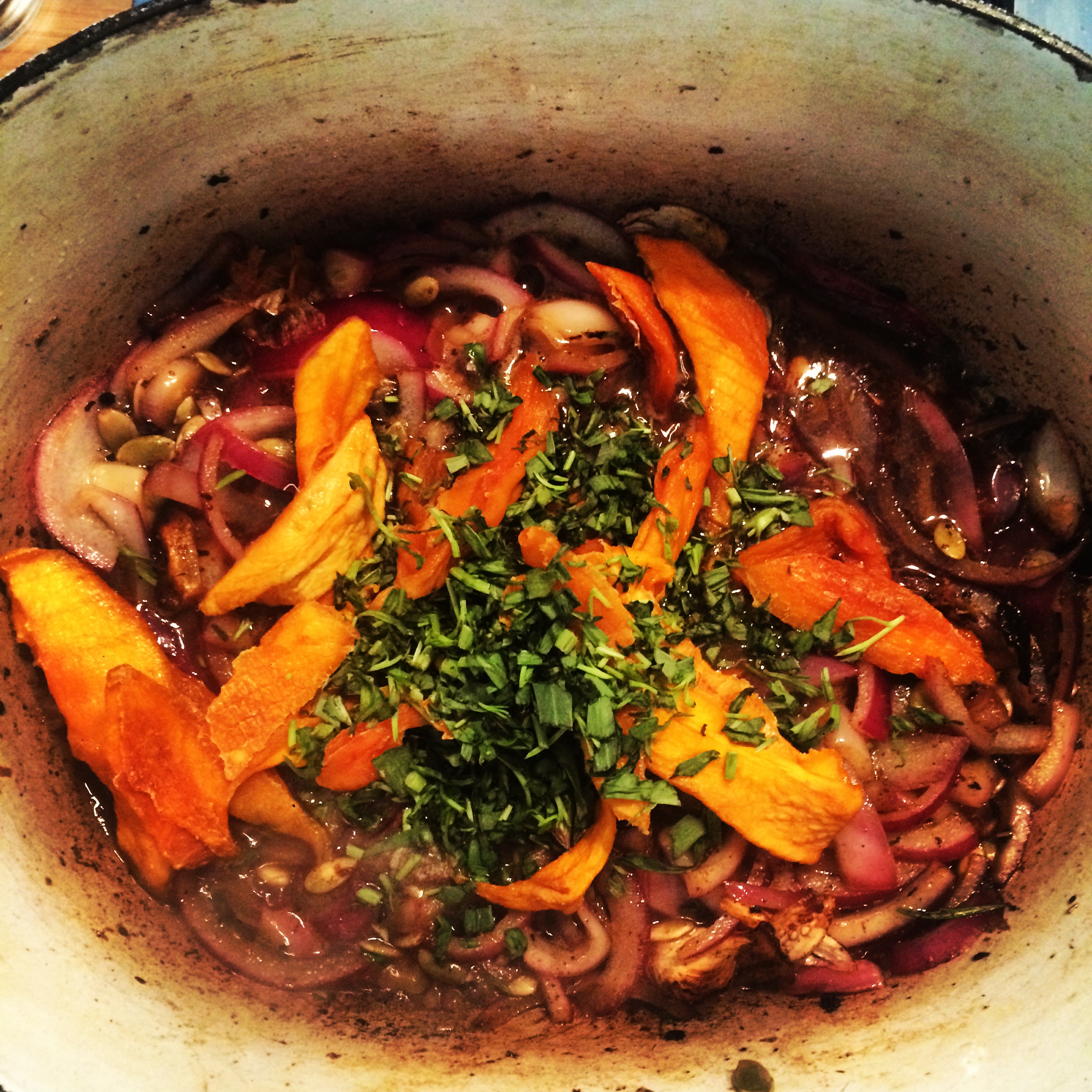 1 leg of lamb, 100g dried mangos, 1 cinnamon stick, 2 tbsp organic runny honey, sunflower seeds