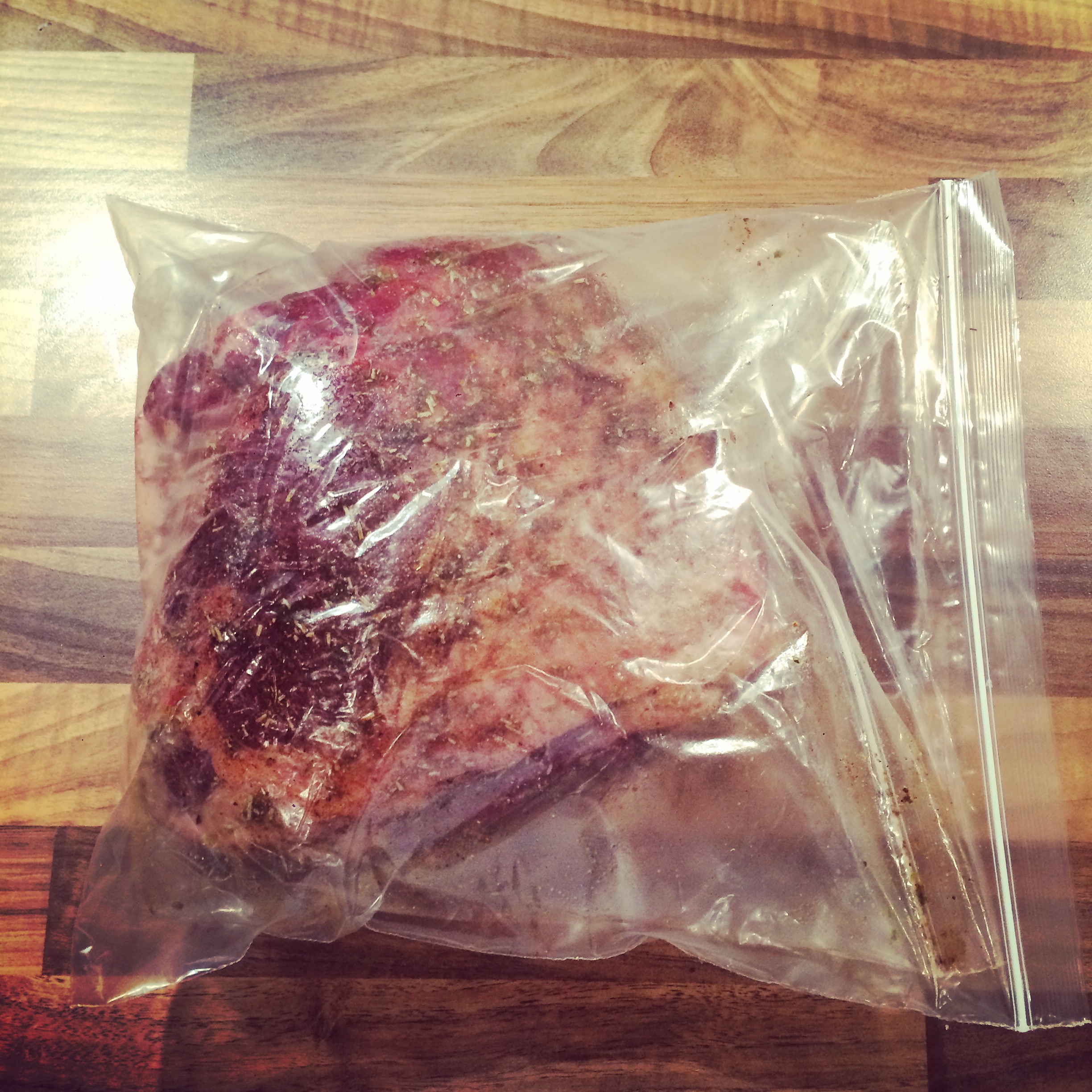 The night before you cook the lamb, rub it generously(!) with olive oil, salt and pepper, the citrus zests and the herbs and spices. Place inside 2 freezer bags… into the fridge it goes.