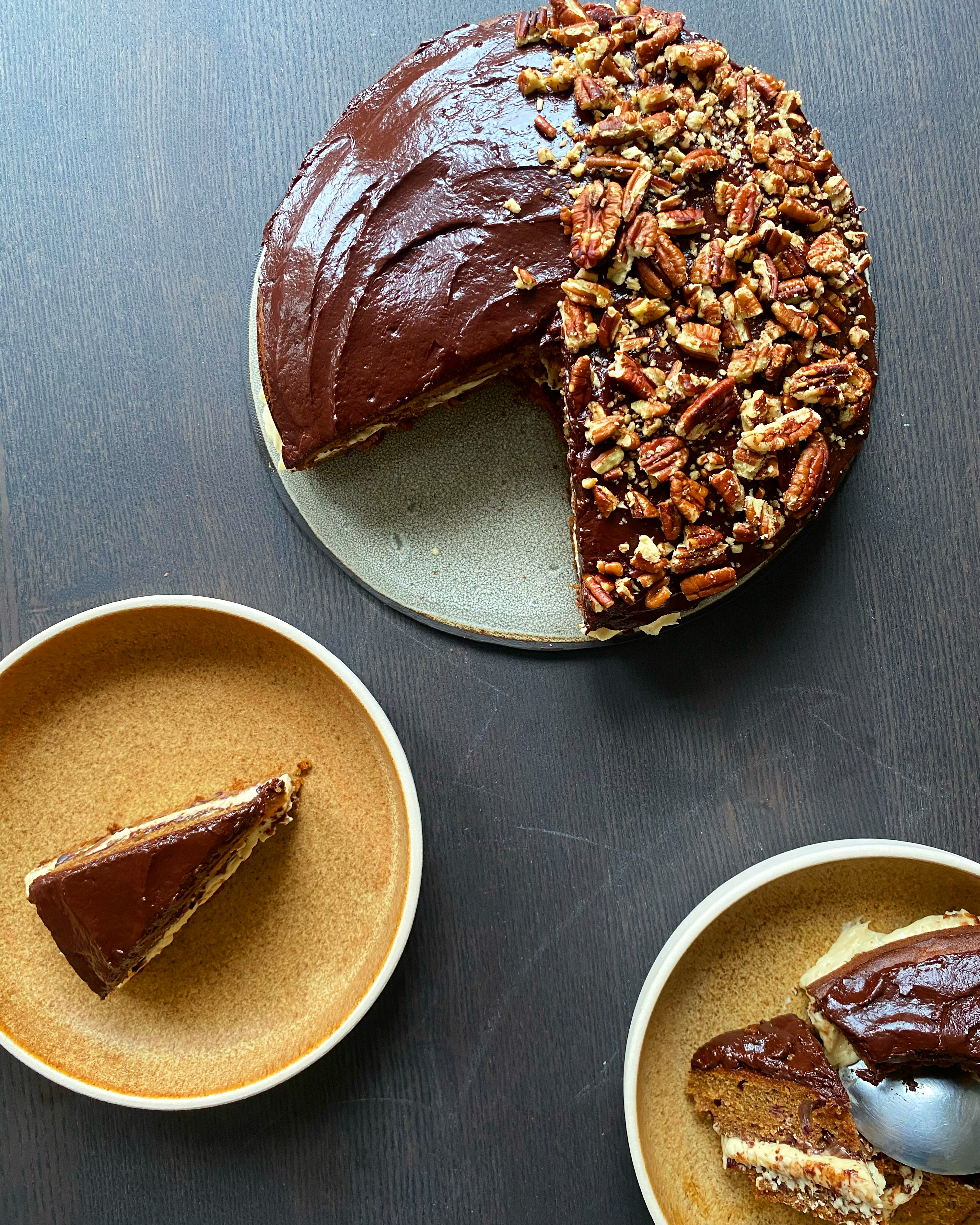 Alas that didn’t happen, and so let’s make some happy memories by eating copious amounts of this sticky toffee pudding cake with miso caramel buttercream and a dark chocolate ganache.