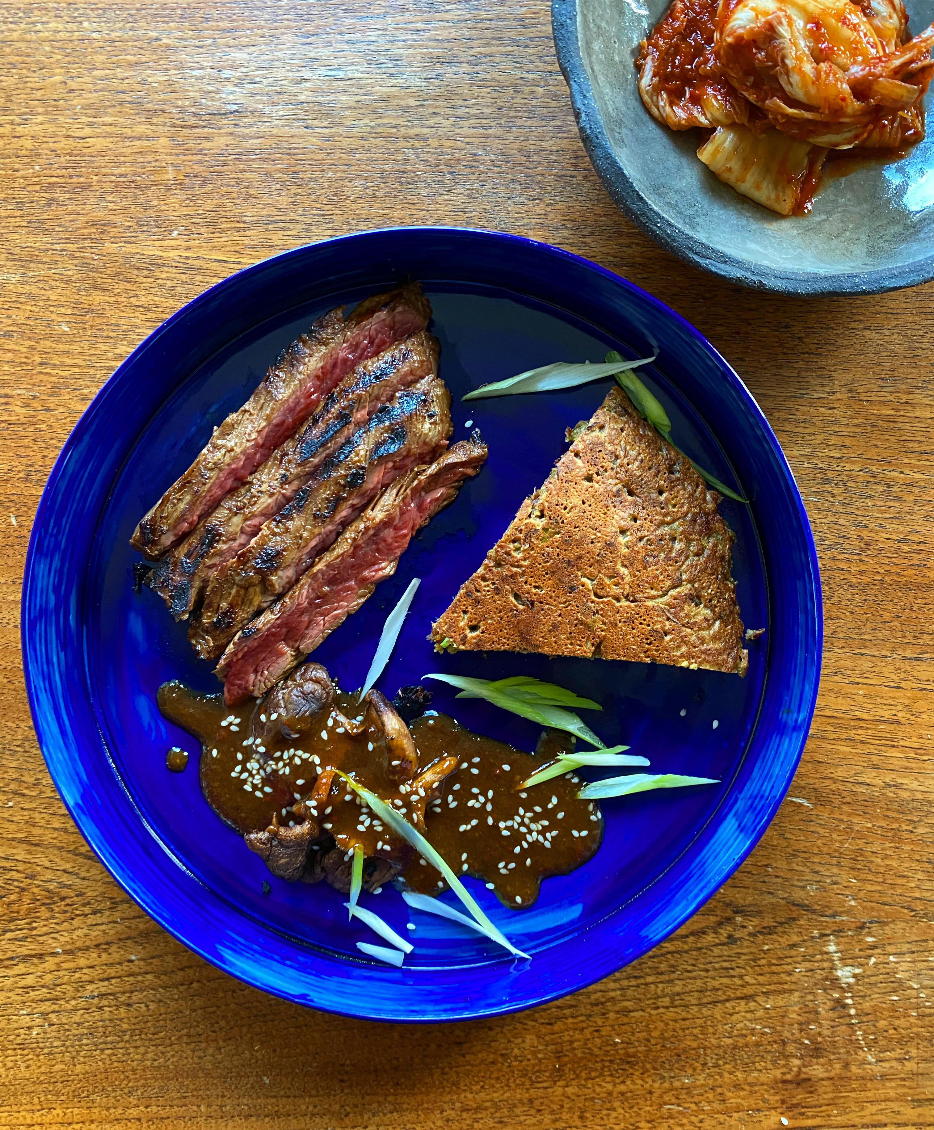 Serve your sliced steak alongside a portion of crispy pancake and mushrooms soaked in the shin reduction. Finish with a scattering of spring onion and sesame seeds, and of course, a bowl of kimchi on the side.