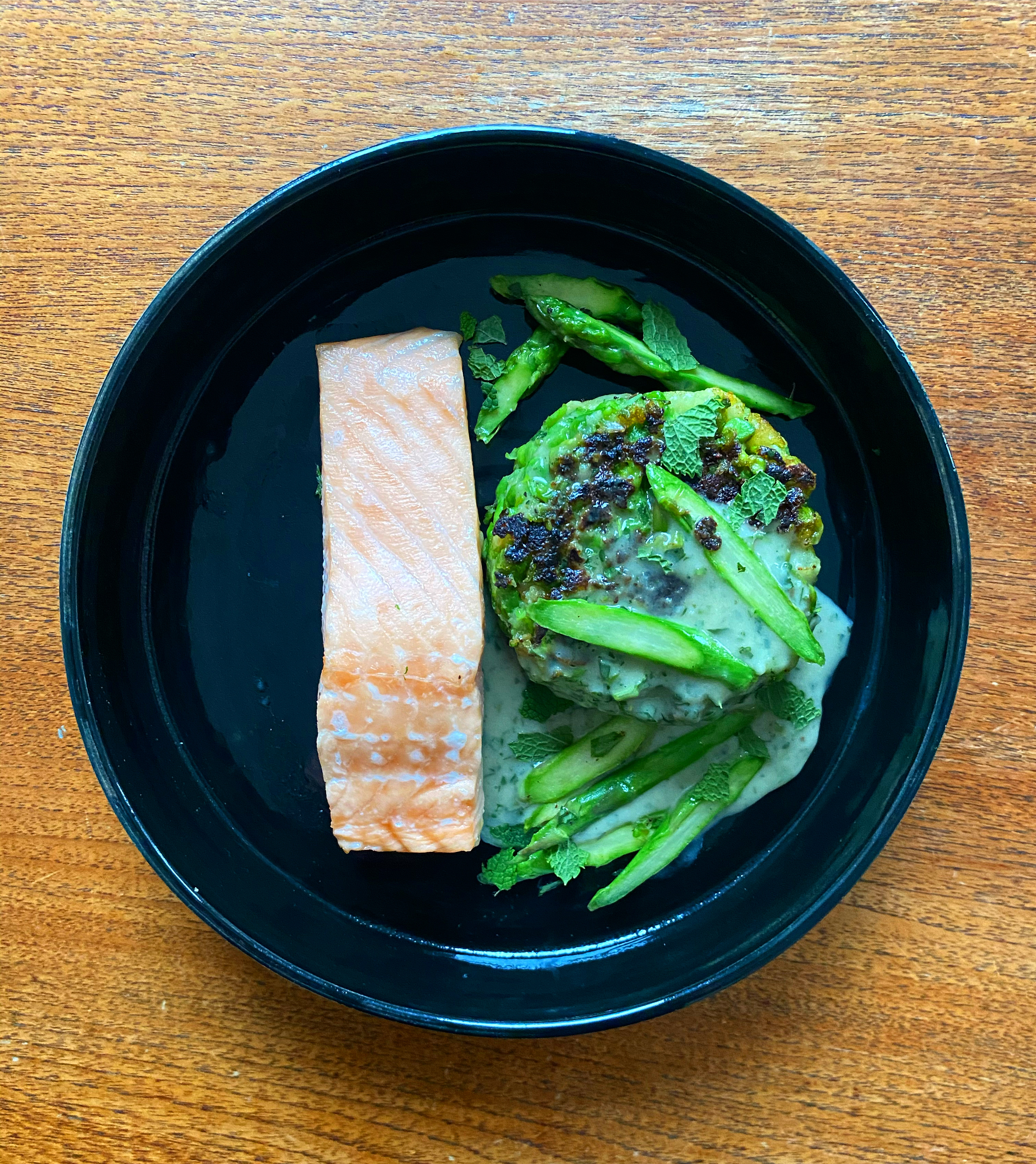 Oh yeah, this is a salmon, pea fritter and tarragon velouté dish.