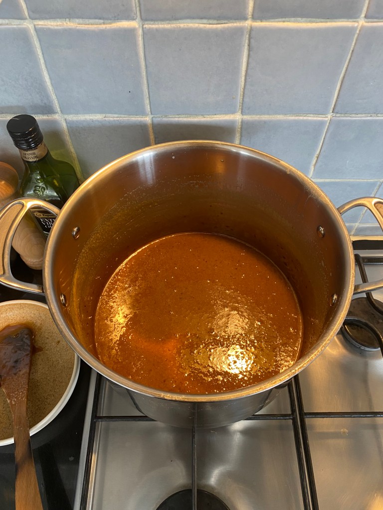 Once simmering, you’re going to leave it for three hours. Stirring regularly with your wooden spoon.