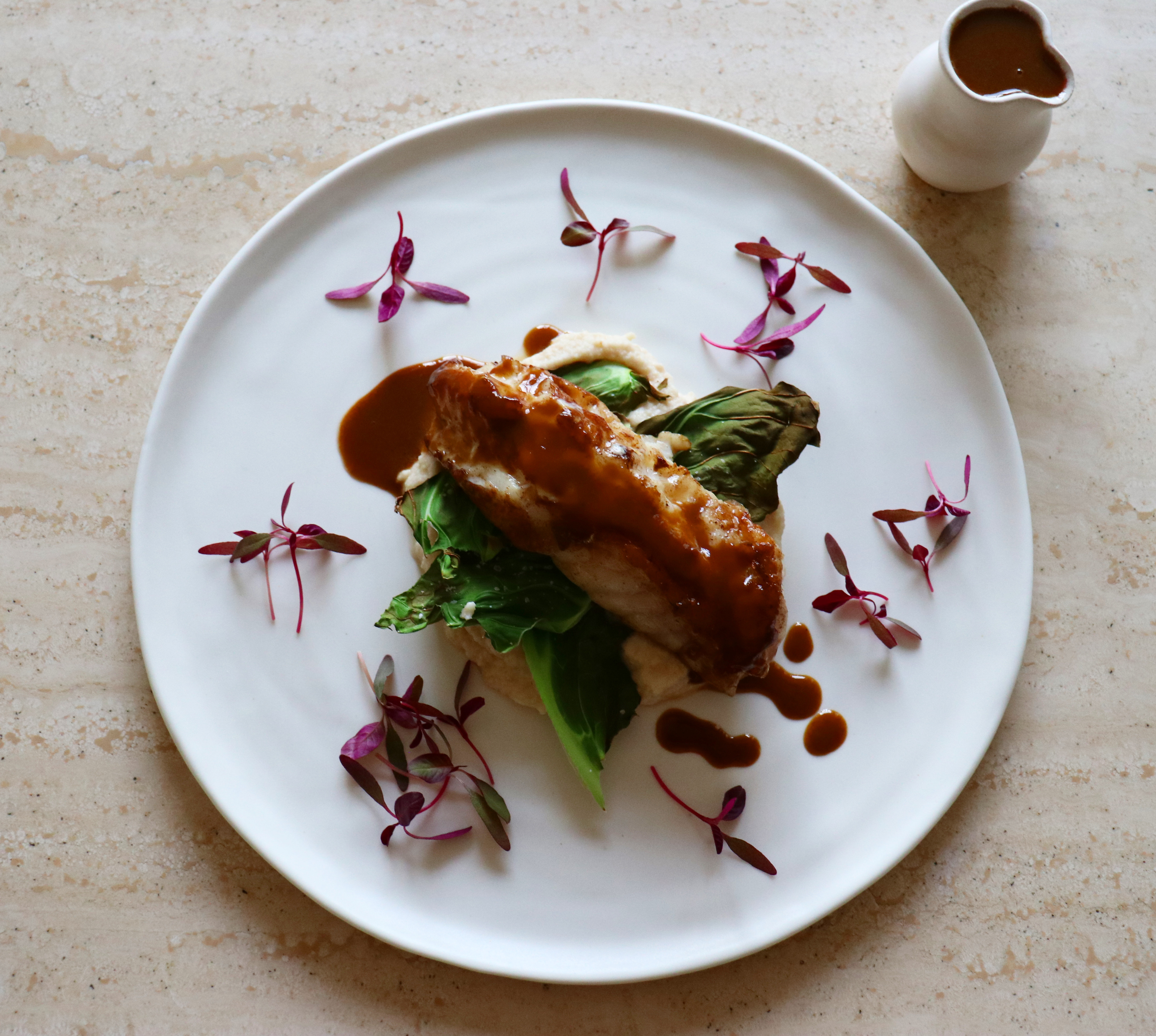 Leave the fillets to rest for five minutes, whilst you place the cauliflower leaves in the hot oven until just crisped. Reheat the purée and sauce.