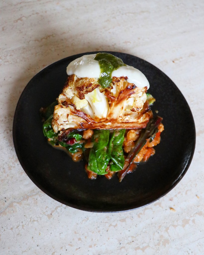 This roasted cauliflower with braised tomatoes, rainbow chard and a vegan béchamel is a banker regardless of the month.