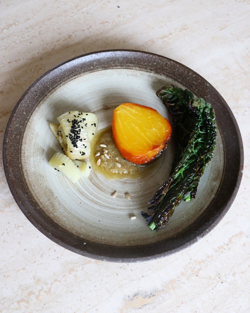 This time, it’s a tasty vegetarian dish, simply showcasing great seasonal produce in the form of roasted golden beetroot, fennel with nigella seeds and garlic, paired with a sunflower seed & butter sauce.