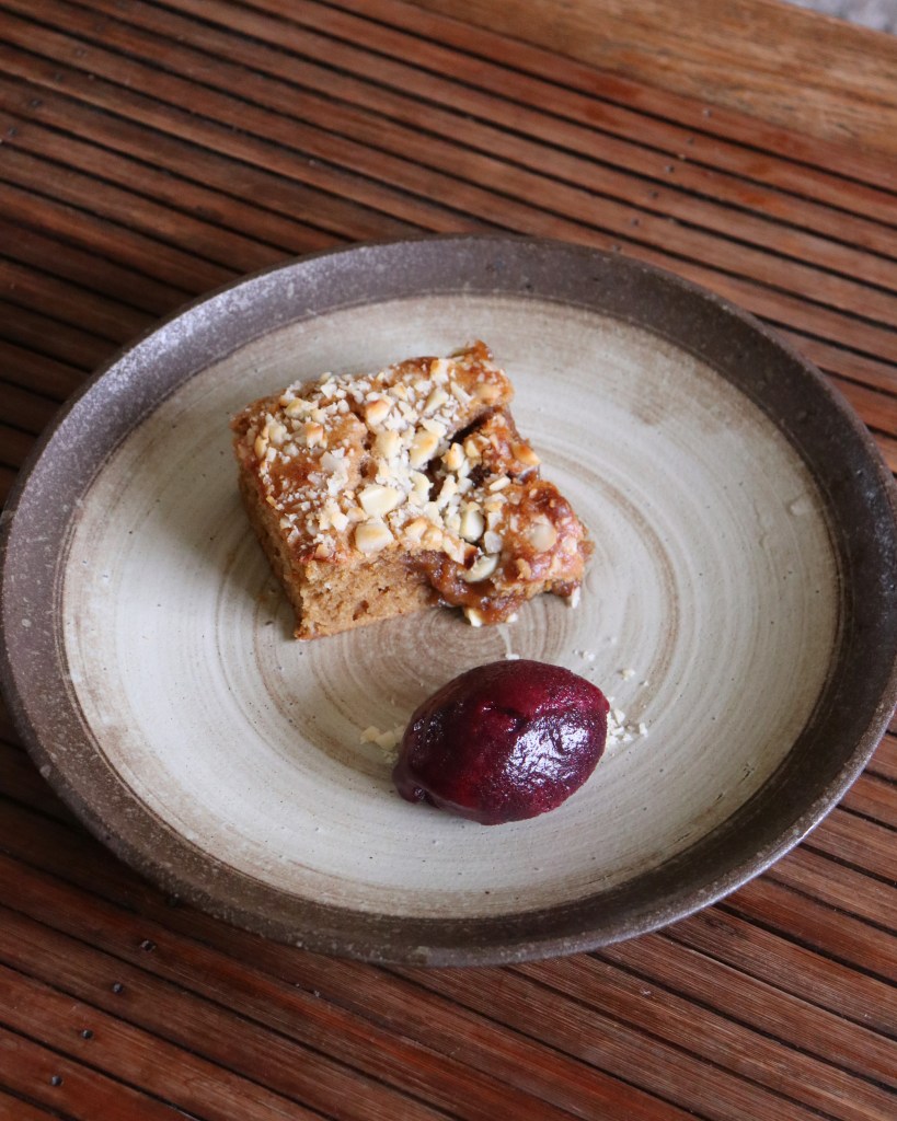 Portion the blondie and serve with a scoop (or quenelle if you’re being fancy) of the blueberry sorbet.