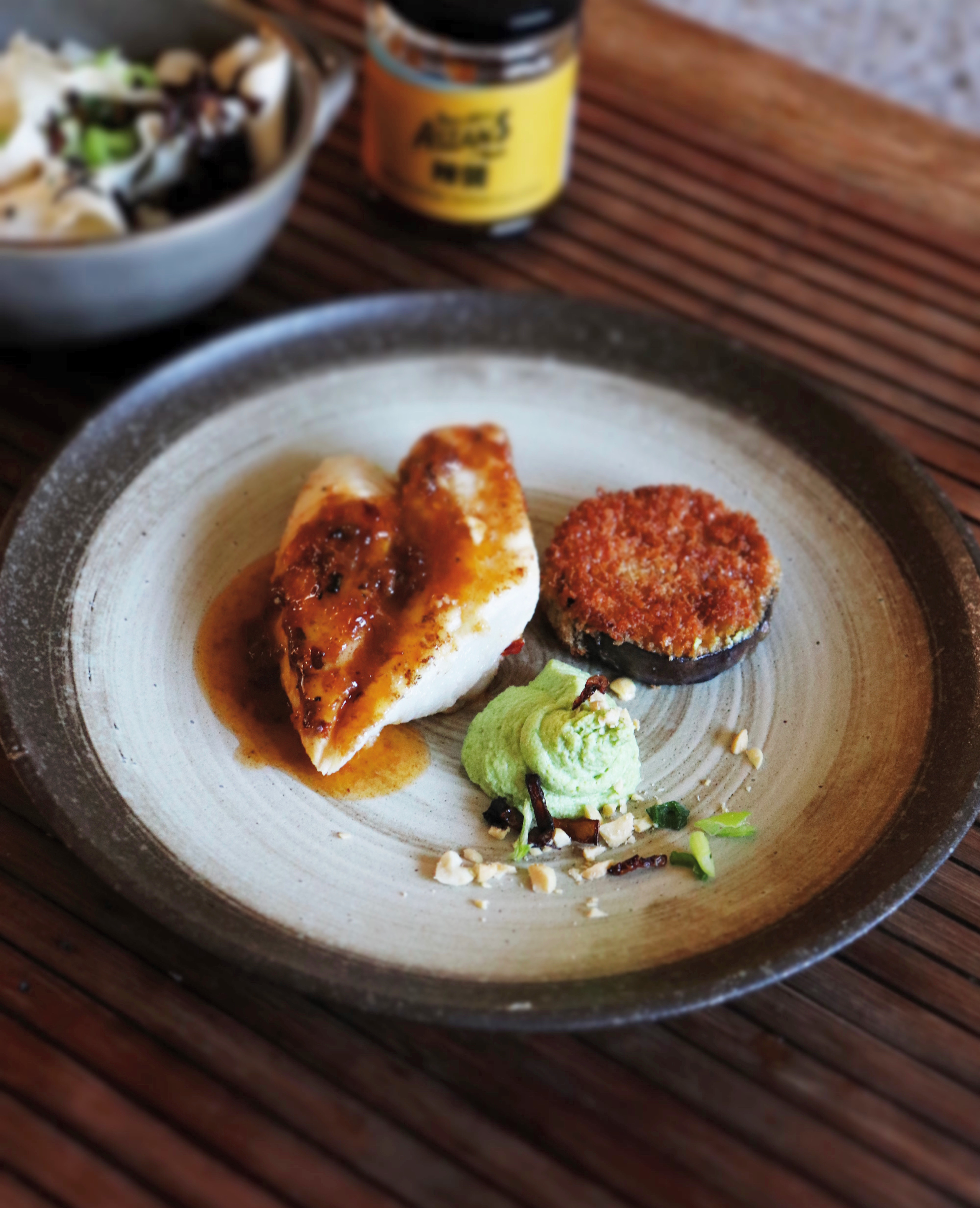 So, I set about making monkfish with an XO butter sauce, burnt edamame purée, panko aubergine, and a bowl of biang biang noodles with peanuts and crispy onion.