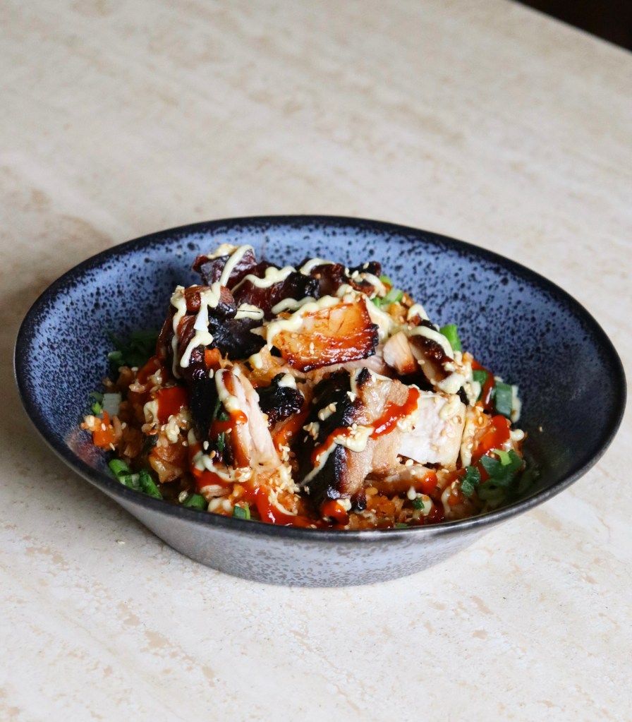 Serve the kimchi fried rice with chunks of pork belly, topped with the chive mayo and toasted sesame seeds. Drizzle over some hot sauce as well, if that’s your thing.