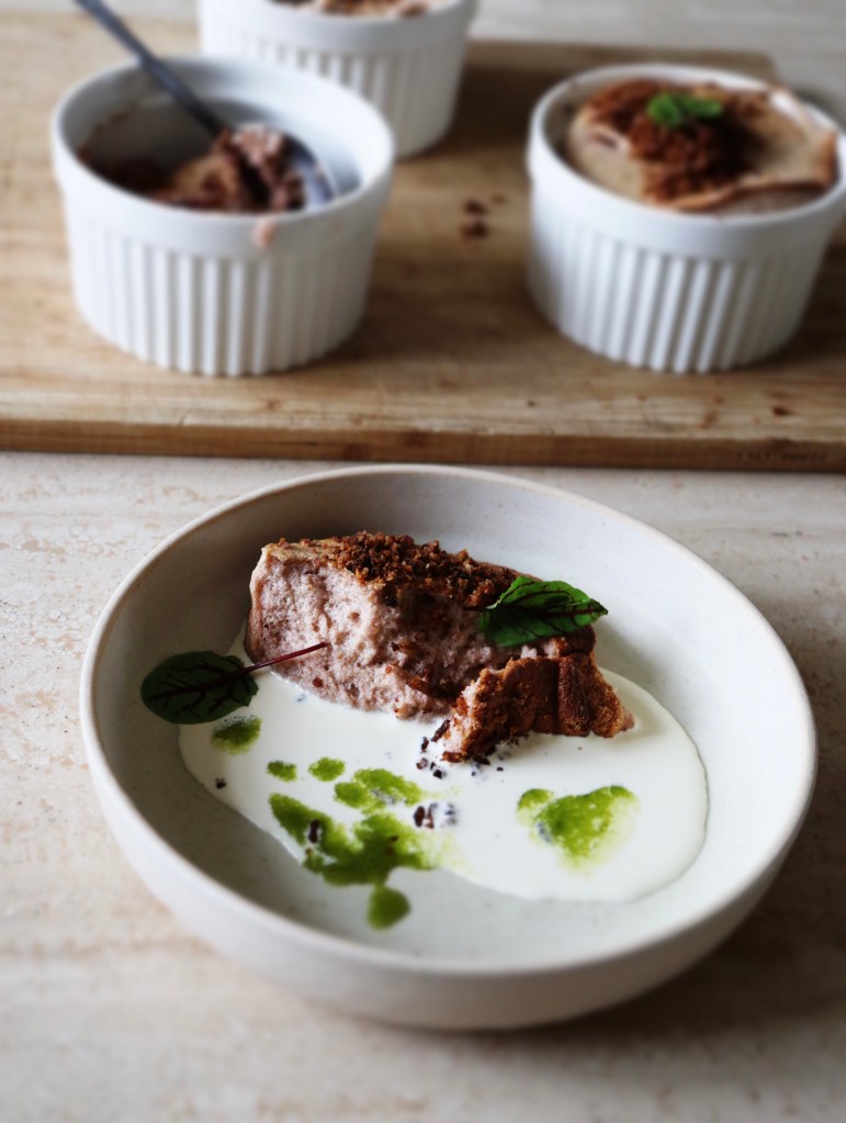 Toasted wholegrain rice, maple & pecan soufflé, served with cream split with sorrel.