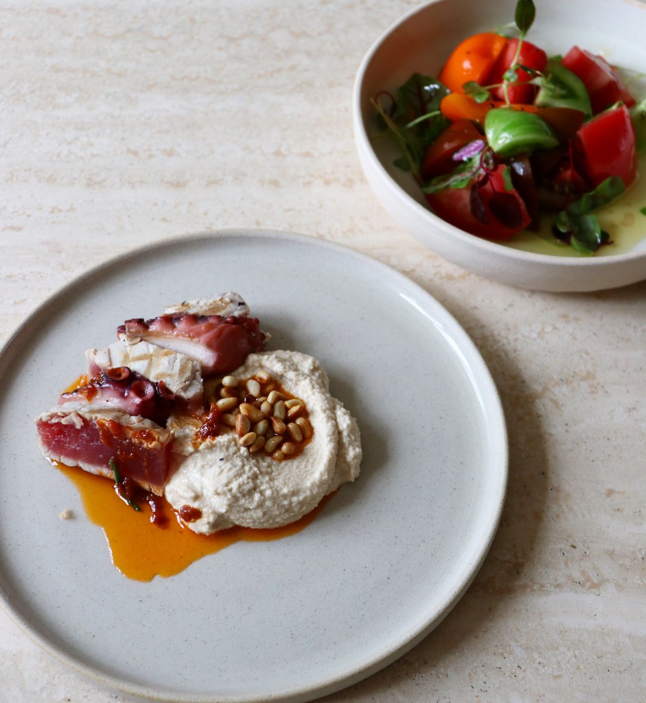 Lightly grilled seafood, caramelised shallot & almond butter, heritage tomato salad.