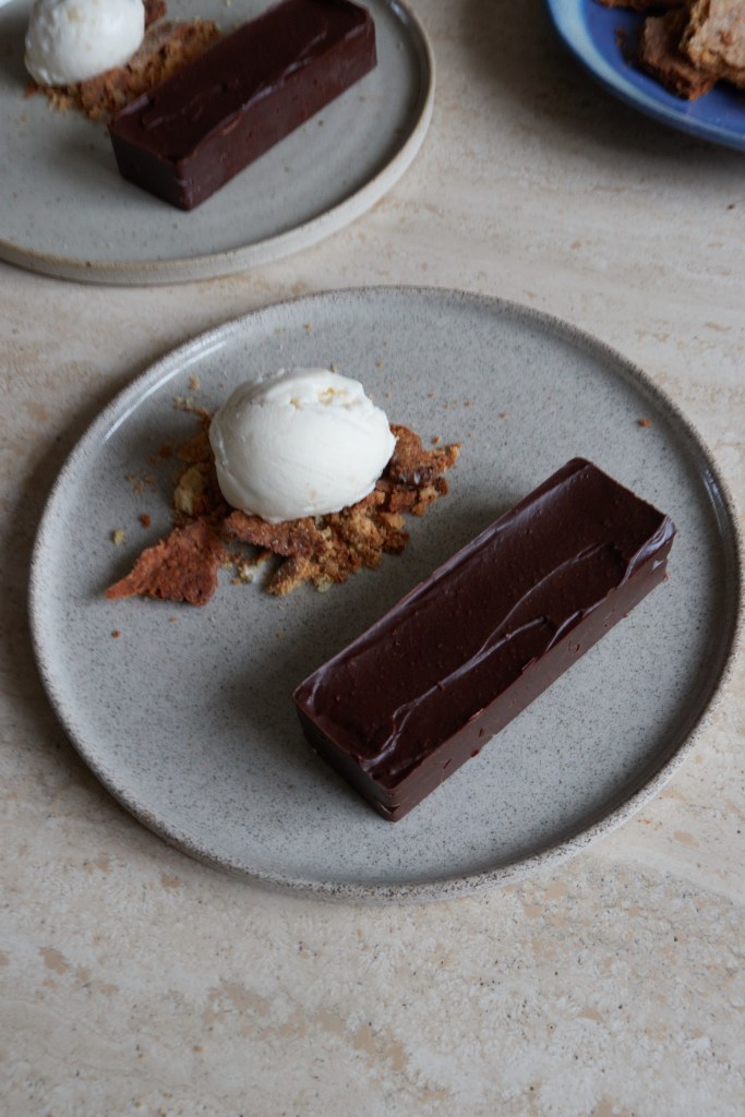 Dark chocolate & rye ganache, grilled pear & milk ice cream, rosemary shortbread