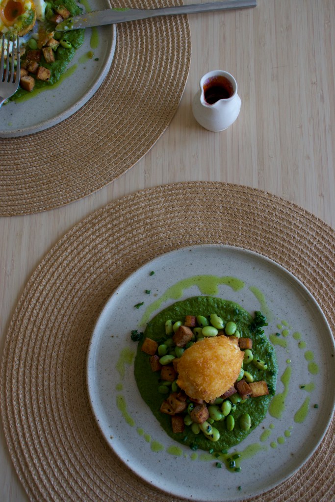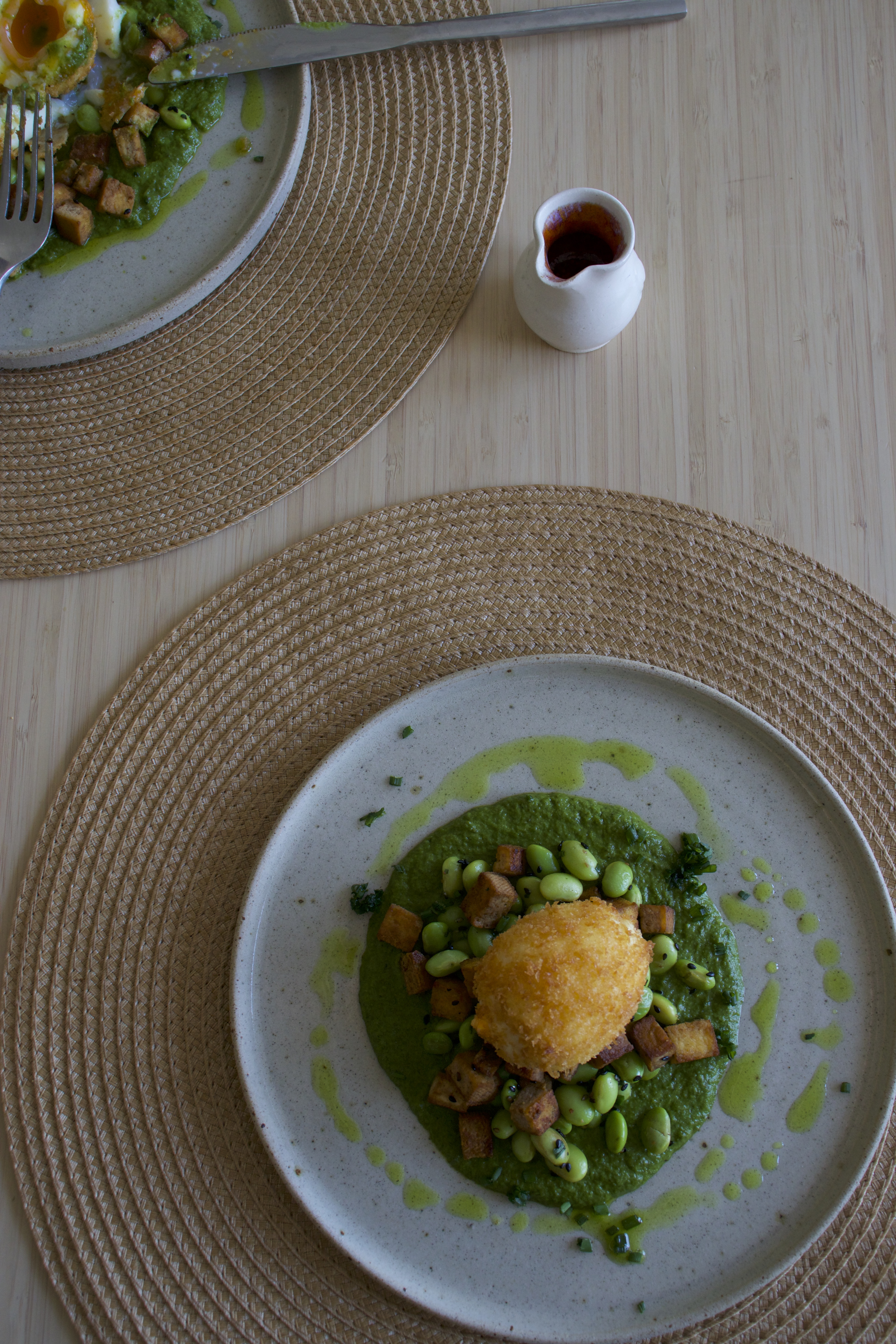 crispy egg, fried tofu and edamame, wild garlic & ginger sauce